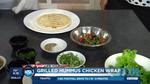 Hummus Chicken Wrap with Baked Sweet Potato Fries Grilled Chicken Wrap: Ingredients: 5 raw boneless chicken breasts 1 lb. egg plant, peeled and sliced 1 1/2 tsp Mrs. Dash Seasoning 1 1/4 C Tomato, diced 1 1/2 Tbsp Kalamata Olives, pitted and chopped 1/4 C Lemon juice 1/4 C fresh Italian parsley, chopped 1/4 C fresh Basil, chopped 5 Pita Bread 3 Tbsp Hummus 10 Green Leaf Lettuce leaves Directions: Preheat oven to 320F; place the chicken breasts on a sheet pan sprayed with non-stick cooking spray. Bake for 13 mintues, or until an internal temperature of 165F is reached; cool chicken, slice. In a pan, spray non-stick spray and cooking eggplant over medium heat. Season with Mrs. Dash; cool. In a bowl, toss tomatoes and olives with lemon juice, parsley and basil. Baked Sweet Potato Fries: Ingredients: 3/4 tsp paprika 1 1/4 tsp granulated garlic 1 1/4 tsp black pepper 1 1/4 tsp brown sugarv 1/8 tsp ground cinnamon 1 lb. sweet potatoes, cut into strips 2 1/2 tsp Olive oil Ingredients: Preheat oven to 375F. In a bowl, combine spices. Season fries with spice mixture; toss with oil to coat. On a sheet pan lined with parchment paper, spread potatoes in a single layer. Bake until tender and golden brown, about 20 minutes. Plate Assembly: Spread 2 teaspoons of hummus on pita bread. Add 2 lettuce leaves, 3 eggplant slices, 1 sliced grilled chicken breast, 1/4 cup tomato/olive mixture. Fold pita over, serve with baked sweet potato fries. Garnish with fresh parsley.