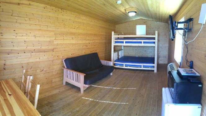 There are also three cabins available for rent in the park. They don't have running water or a bathroom, but they have electricity and offer a refrigerator, microwave and TV. Each cabins sleeps six people.