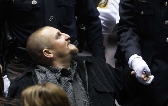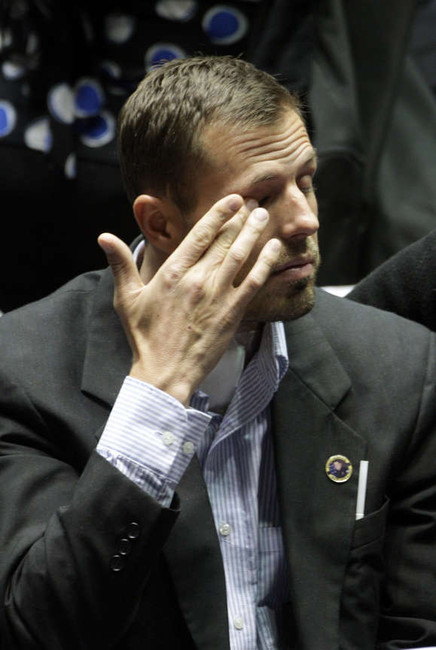 His wife carried one of their daughters into the arena, with pink ribbons in her hair, and another woman carried the other daughter.