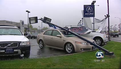 At the Mike Hale Acura dealership in Murray, wind gusts knocked over a light pole, and it smashed right on top of a car.