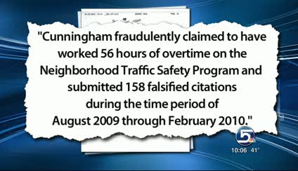 Charging documents claim former officer Eric Cunningham, 31, "fraudulently claimed to have worked 56 hours of overtime on the Neighborhood Traffic Safety Program and submitted 158 falsified citations during the time period of August 2009 through February 2010."