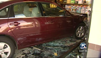 "Luckily there was only one person at the magazine rack there. He heard the glass breaking," said Sgt. Gary Young with the Cottonwood Heights Police Department. "It was a pretty slow-speed accident so he was able to jump out of the way and escape and the car came to a rest up against the magazine rack."