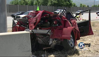 The Utah Highway Patrol says the driver of a red Lexus was going extremely fast around the curve when he lost control. His car went into the median backwards and slammed into the base of an overhead sign.