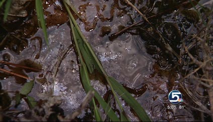 The Parkin family first noticed the oil sheen on water that flows through their backyard about a year and a half ago. Several neighbors, too, found a similar sheen in water in their yards.