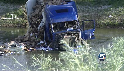 According to the Utah Highway Patrol, the semitrailer hauling boxes of store-brand cleaning products and soap was southbound around 6 a.m. when it veered off a bridge and into Bear River.