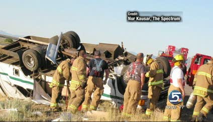 Utah Highway Patrol Trooper Cameron Roden says the van was on its way from Las Vegas to Bryce Canyon National Park. It was headed northbound on I-15 around 7 p.m. Monday when the driver somehow lost control. The van hit the median and rolled near mile marker 66.