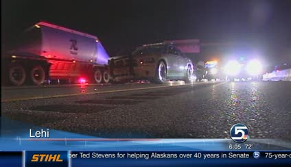 A trooper from Utah County saw a white sedan headed north in the southbound lanes. As he spun his cruiser around to catch the car, the sedan slammed into his vehicle head on.