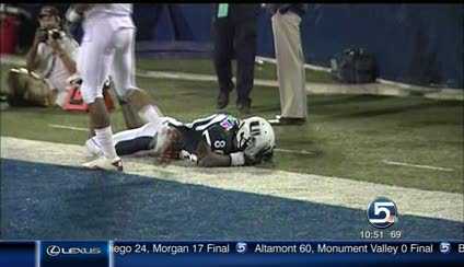 Utah State scored first in the game on an eight-yard pass play from a scrambling Borel to Dontel Watkins. The teams then traded scores and the first half ended 17-17.