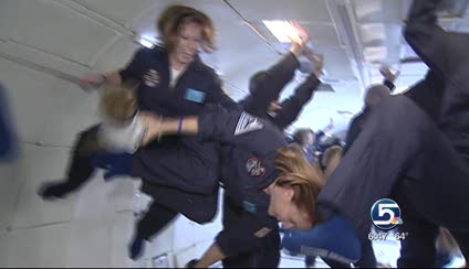 Zero gravity is achieved within the aircraft when specially-trained pilots perform a series of "parabolas," or arcs between the altitudes of 24,000 and 32,000 feet. At the beginning of each arc, the aircraft climbs at a 45-degree angle, then rolls into a controlled descent that creates a temporary zero-gravity environment, lasting for about 30 seconds. The maneuver has been used for more than 50 years in training astronauts as well as in making Hollywood film productions.