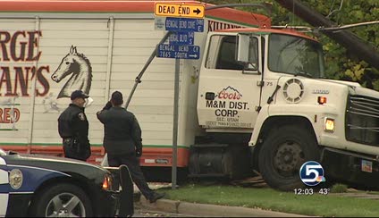 SALT LAKE CITY -- The driver of a delivery truck was trapped in his vehicle after it slid into a power pole, knocking it onto the truck. Police are investigating whether a winter-like storm that blew into the Wasatch Front overnight was a factor in the crash.