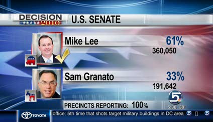 Republican constitutional law attorney Mike Lee defeated Democratic restaurateur Sam Granato, giving Lee his first election victory since he served as Brigham Young University's student body president in the 1990s.