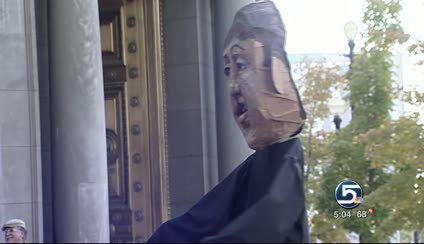 "Super-sized" mascots — supporters of DeChristopher's — portrayed various roles in the trial — the U.S. Government, a judge and Dr. James Hansen, a noted climate change scientist. The fossil fuel industry and corporations, as well as "citizens," were also put on trial.