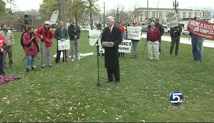 For the fourth Bush visit in a row, the former Salt Lake City mayor is involved with a rally talking about what he calls Bush's war criminal record.