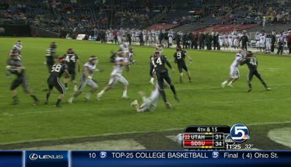 San Diego State was pinned deep in its own territory on its next possession, when Stahovic dropped the snap on fourth down. He picked up the ball, but Bird got a hand on the punt and put Utah in position for Wide's go-ahead score.