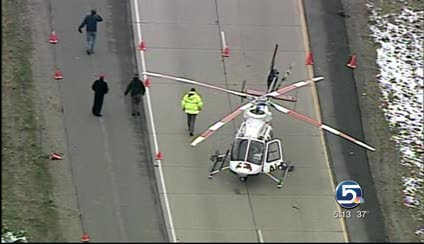University Hospital official Ryann Rasmussen tells the Salt Lake Tribune there were no injuries after a rear rotor of the AirMed helicopter clipped a road sign and the aircraft landed Monday on Interstate near Ogden.