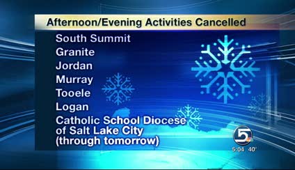 SALT LAKE CITY -- The Granite School District has canceled all afternoon and evening activities because of the weather. It's the same story in many other districts across Utah including: Davis, Granite, Jordan, Murray, Ogden, Tooele, Cache and South Summit school districts.