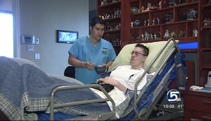 In Jessie's apartment, there's an elaborate rail system allowing those who help to lift and transport him from room to room. At an indoor swimming pool down the hall, the rail lowers him into the water where he can swim his own way, doing doggy paddles with his arms and hands. He has his own elevator between floors.