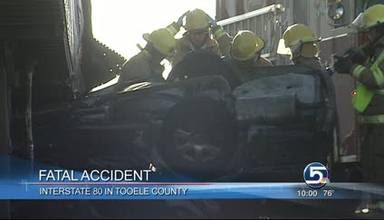 TOOELE -- Two people died as a result of a Sunday afternoon accident when a car got pinned under a semi-truck on I-80.