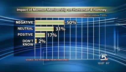 In Utah, 50 percent of registered voters surveyed by Dan Jones & Associates said Huntsman's and Romney's Mormonism will impact their campaigns negatively. Nearly one-third said it would have no impact but just 17 percent saw membership in the church as having a positive effect on the race.