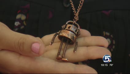 "Quirky" is the right word to describe Meg's jewelry, but it's also very whimsical and unique. Many of them revolve around a robot named Chandler, and they've caught the eye of stylists on The Voice as well as Dia's coach, Blake Shelton.