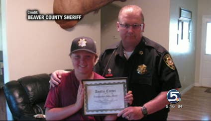 Beaver County Sheriff Cameron Noel said officers were so impressed with Austin's efforts, they decided to honor him with a "Distinguished Citizen Award," which they presented to him at his home in late June. Austin received a sheriff's hat, some commemorative coins and an unspecified reward from the rightful owner of the found cash.