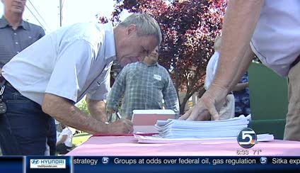 They plan to collect thousands of signatures during Monday's Days of '47 Parade through downtown. Several people stopped to sign the petition at Thursday's late afternoon gathering.