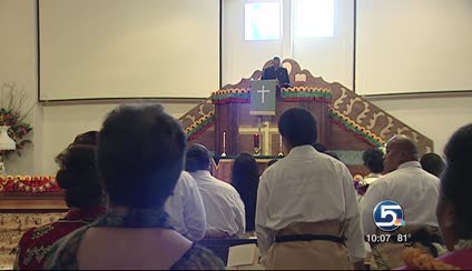 After the rededication, the 300-plus member crowd took the festivities outside, where youth danced and sang and the congregation feasted at tables lined with roasted pigs and elaborate fruit displays.