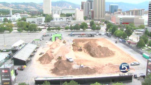 But before any athlete flies sky high on a BMX bike or guns a motorbike over a towering jump, there's a lot of scooping, dumping and smoothing of dirt to be done to transform a parking lot near Temple Square into a bedeviling Dew Tour track.