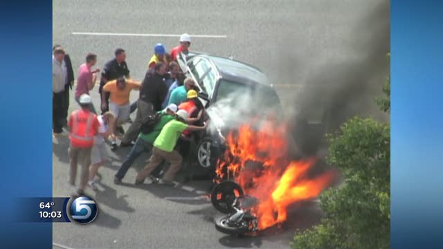 LOGAN — Dozens of bystanders are being praised for their part in saving a motorcyclist's life in Logan Monday morning. A nearby camera captured them pulling the man out from under a burning car.