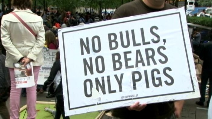 Protesters in St. Louis stood on a street corner a few blocks from the shimmering Gateway Arch, carrying signs that read, "How Did The Cat Get So Fat?," "You're a Pawn in Their Game" and "We Want The Sacks Of Gold Goldman Sachs Stole From Us."