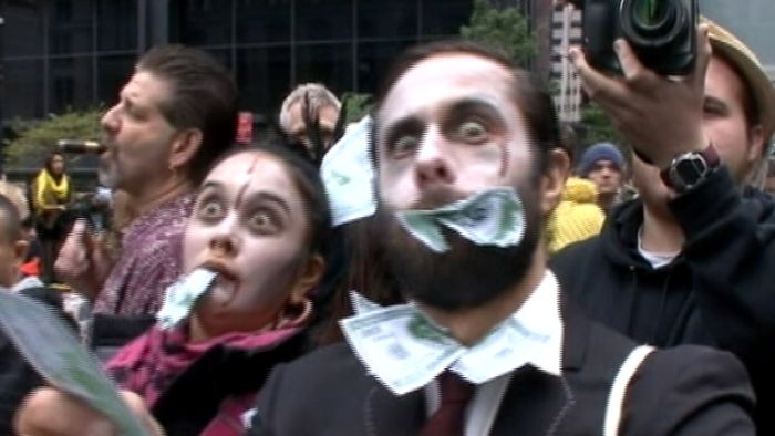On Monday, the "zombies" stayed on the sidewalks as they wound through Manhattan's financial district chanting, "How to fix the deficit: End the war, tax the rich!" They lurched along with their arms in front of them. Some yelled, "I smell money!"