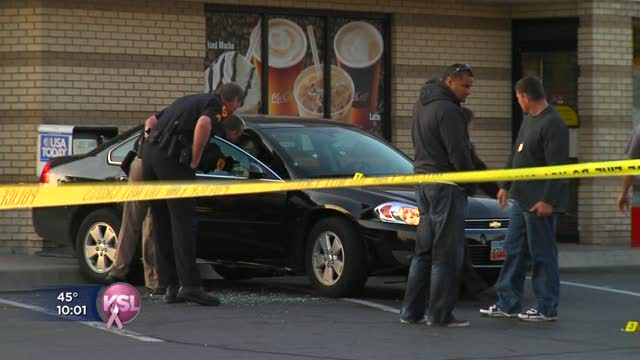 Yellow crime scene tape surrounded the perimeter of McDonald's, 210 W. 500 South, Friday. A passenger vehicle, with its rear backed up to the curb next to the building on the east-side of the restaurant, had two bullet holes in the windshield and the side passenger window was shot out.