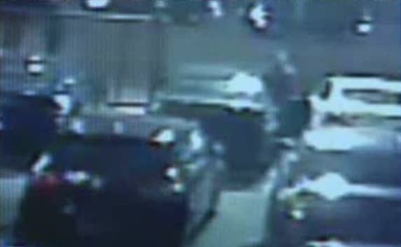 Surveillance cameras caught some thieves push a salesman away from a car they were test driving and then take off with the wheels.