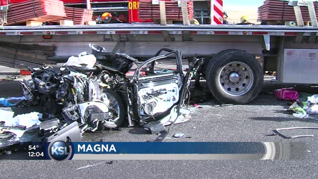 It's believed the semitrailer was pulling onto the 2100 South freeway to head west around 7:53 a.m. Wednesday when the car traveling east collided with it. The woman was extricated around 9:10. She was flown to University of Utah Hospital in very critical condition.