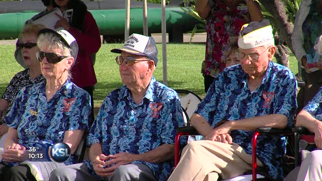 The marching band from Timpview High School in Provo came to the Punchbowl Cemetery pay their respects to the 28,000 veterans of the Pacific who are buried there. Max Burggraaf, now 93 years old, also came from Utah, along with 90-year-old Ken Potts.