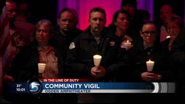 OGDEN — The mood was muted and solemn as several hundred members of the Ogden community came together to honor one killed and five wounded police officers at a candlelight vigil Thursday night.