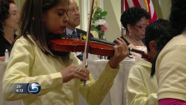 Twenty-five fourth grade violin students, from Salt Lake City's Bennion Elementary School, played for the nearly 400 luncheon-goers. Many of the students are from immigrant families coming from places such as Somalia, Burma, Croatia, Mexico, Guatemala and West Africa, teacher Carly Winslow said.