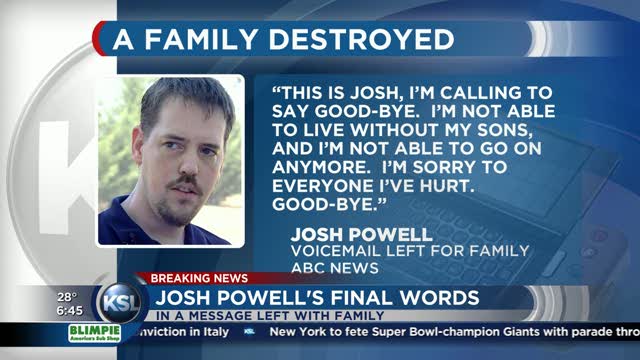 Josh Powell left a voicemail for his sister about 20 minutes before the fire started. He said: "This is Josh. I'm calling to say goodbye. I'm not able to live without my sons, and I'm not able to go on anymore. I'm sorry to everyone I've hurt. Goodbye."