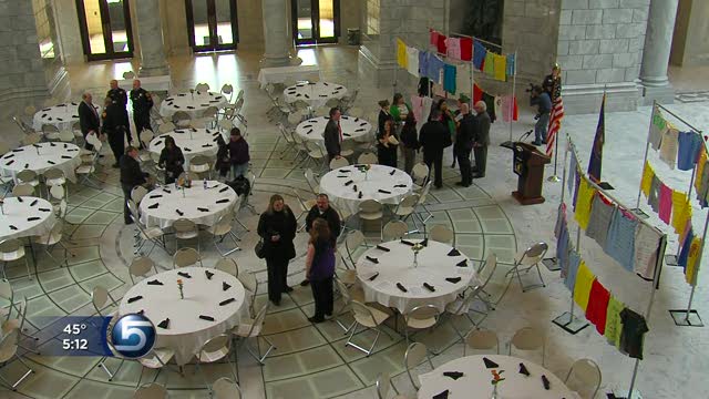 In the rotunda of the state Capitol on Monday, advocates for stopping domestic violence displayed The Clothesline Project. More than 100 shirts were hung on clotheslines around the rotunda. On each shirt was a message written by a victim of domestic or sexual violence expressing their feelings about the experience.