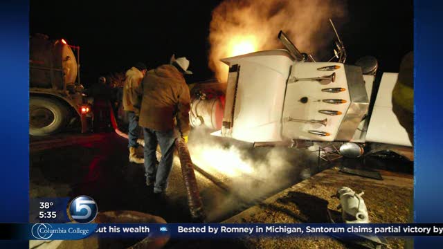 Police say the driver drifted to the right side of the highway while he was eastbound then over-corrected. The rig fell across all lanes of the road.