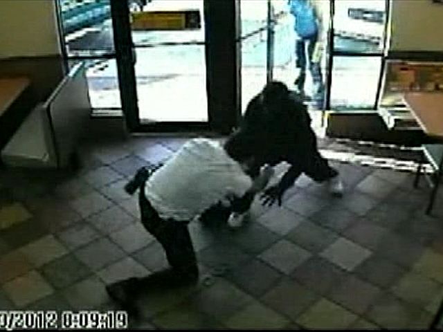 The homeless men were inside the fast food restaurant and one man grabbed Davis' feet while the other helped him down.