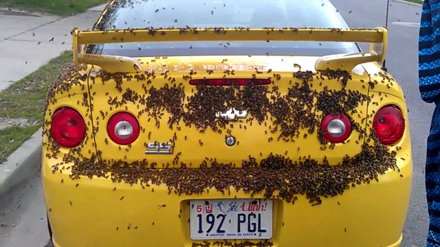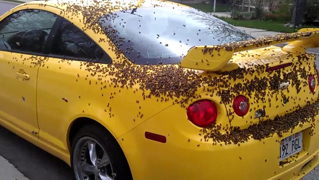 Key didn't quite believe his son at first, but eventually the boy persuaded Key to come outside, where indeed there were hundreds if not thousands of bees swarming on and around the yellow Chevy Cobalt.