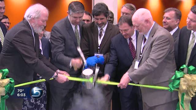 Liquid nitrogen was used to freeze the ribbon, as the governor and university president used hammers during a science experiment, officially opening Utah Valley University's new science building.
