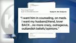 She ended the letter by writing, "I want him in counseling, on meds, I want my husband, friend, lover BACK no more crazy, outrageous, outlandish beliefs/opinions."
