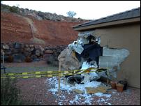 Wanda Denhalter doesn't remember much about what happened, but her husband has pieced together the facts by looking at pictures and examining the area near, around and above the house. He's figured out that the boulder snapped off a cliff face, dropped about 30 to 40 feet until it hit a slope and then bounded toward the house, leaving huge divots every 30 feet. It broke in half before bouncing into the corner of the bedroom.