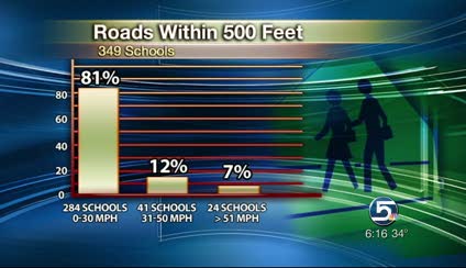Of 349 public and charter schools, they found 41 are within 500 feet of roads with moderate speed limits. In addition, 24 schools, or 7 percent, are close to highways where the speed limit is above 50 and kids' exposure to pollution is presumably the highest.