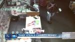 The man seen stealing the donation container wore white sunglasses, a plaid shirt and jeans. He drove away from the store in a teal-colored Dodge Intrepid, according to police.