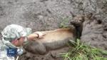 McConnell said they took a break from hunting when they started to hear a slapping sound. They followed the noise to find a calf elk stuck in the mud and crying.