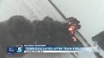 CASSELTON, N.D. (AP) - Authorities urged residents to evacuate a small North Dakota community Monday night after a mile-long train carrying crude oil derailed outside of town, shaking residents with a series of explosions that sent flames and black smoke skyward.