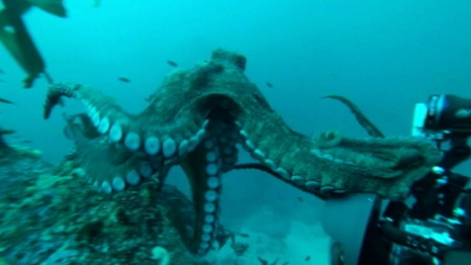 The shy but very curious octopus wrapped all eight of its long legs around Murray's camera. Malvestuto kept his camera rolling and recorded the incredible sight of Murray wrestling with the octopus.
